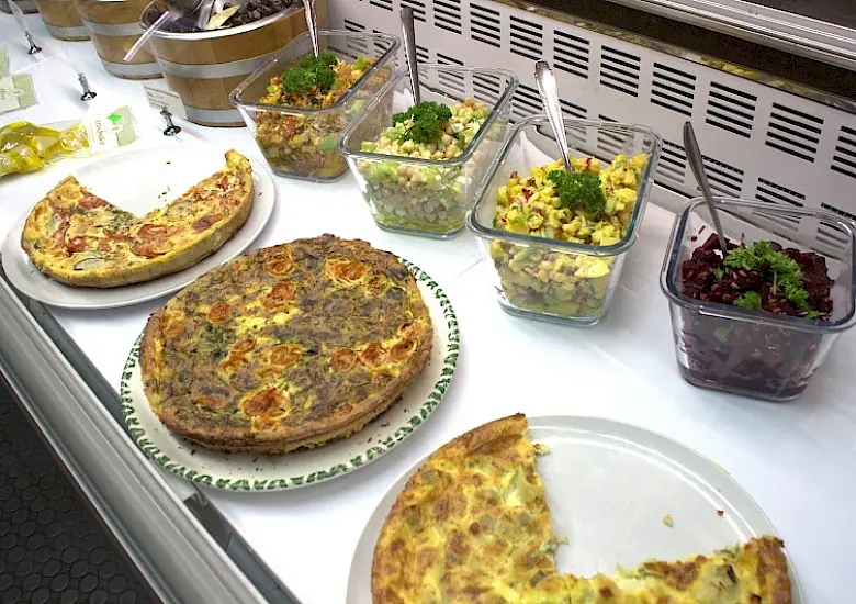 Wir bieten selbstgemachte vegane und vegetarische Salate, Gemüse Quiches von der Konditorei Löwenzahn, Oliven und Antipasti an. Sie können gerne Ihr eigenes Gefäß mitbringen.